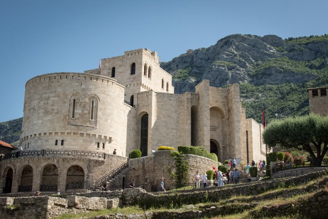 We dropped anchor in the harbor of Albania’s largest and most prosperous port of Durrës. This seemingly modern city contradicts its antiquity as ships have been docking here since the 7th century BC when it was known as Epidamnos. We boarded two comfortable and air conditioned buses – it was already in the mid-80’s and drove through the Albanian countryside to the village of Kruja. Our guide Iliya told us the word means,“spring” and it was this spring, which provided an endless supply of water to the fortified town and allowed them to resist attack. Our first stop in this mostly medieval city was the famous historical museum dedicated entirely to the person of Albania’s national hero Skanderbeg who broke from the Ottoman overlords and kept Albania free from the Turks for almost 40 years. We saw a great fresco of Skanderbeg defeating a Turkish force painted across an entire wall.The view from the 2nd floor balcony was fabulous and we could almost see the Adriatic Sea. I think we all found our next stop at the 18th century home of a rich merchant fascinating. It had an olive oil press on the bottom floors and the domestic quarters on the upper levels. I was not expecting to see a separate area for the women but it was from my perspective the most beautiful of the rooms!