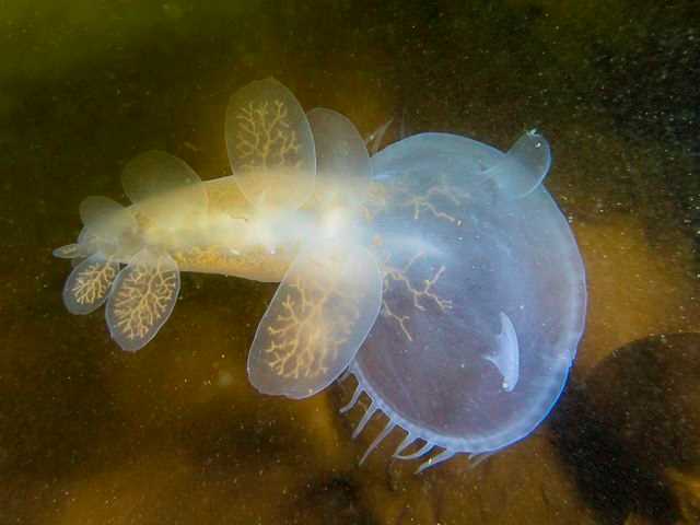 We arrived to Kuiu Island shortly before breakfast and dropped the anchor at Halleck Harbor in Saginaw Bay. The whole setting is picturesque, and one offering excellent conditions to explore on foot, by kayak or paddleboard. Hikers had a great time exploring the intertidal region and the forest, being able to subsequently learn about many of their inhabitants, including a pair of seldom seen rough-skinned newts. Along the shore, they saw numerous marine creatures including stars, sponges, jellies, and tunicates. Those that ventured into the calm waters enjoyed the freedom and quiet that only a kayak can provide and got the chance to see a few sea otters floating around. Kayvon Malek and I went scuba diving and brought back underwater images of many of the fascinating creatures living beneath the waves of Saginaw Bay for everyone on board to enjoy. Rainbow, rose, morning sun and sunflower sea stars, glassy tunicates, candy stripe shrimp, lemon, white and hooded nudibranchs, plus black and quillback rockfishes where among those animals that made it into the video.