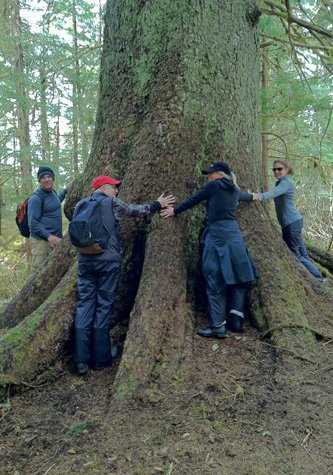 Signs of wildlife were plenty: tracks and chomped-off skunk-cabbage heads and scat of the Sitka black-tailed deer; squirrels’ spruce cone middens; the calls of birds, including the long melodious winter wren and the short trill whistle of the varied thrush. A silent pause during the long hike was rewarded by the sudden swoop of an eagle through the clearing. Whether short or moderate or long hike, all who entered the forest were rewarded with her beauty and magic. What a lovely day!