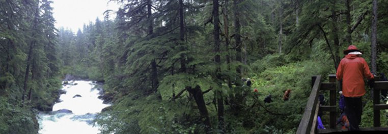 Ferns, brambles, dwarf dogwoods, and May lilies have to poke through a blanket of moss covering almost everything in the understory of the forests near Lake Eva. The trail leads through primeval corridors above a winding stream. Kayakers stood on clams before pushing into solitude. Many hikers continued to the lake or walked to a pool above a waterfall that was filled with pink salmon.