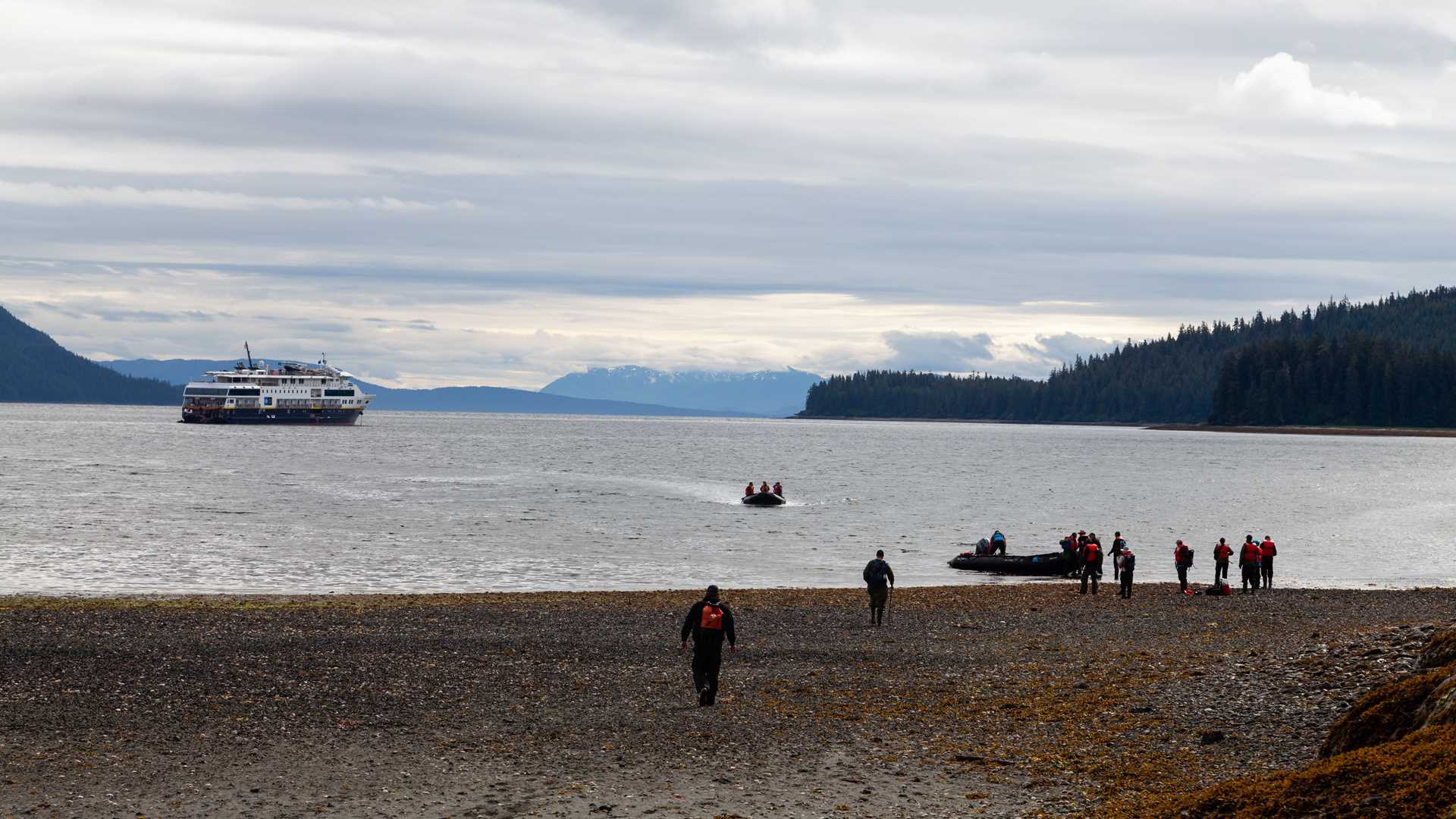 Today we woke up in Hanus Bay to overcast skies with a bit of sunshine on the mountains of Baranof island. As our hard-working deck crew lowered the inflatable boats, we had a delicious breakfast prepared by our talented galley team. We disembarked the vessel from the fantail and headed to shore, with the Zodiac drivers taking extra care to land the boats on a very low tide.