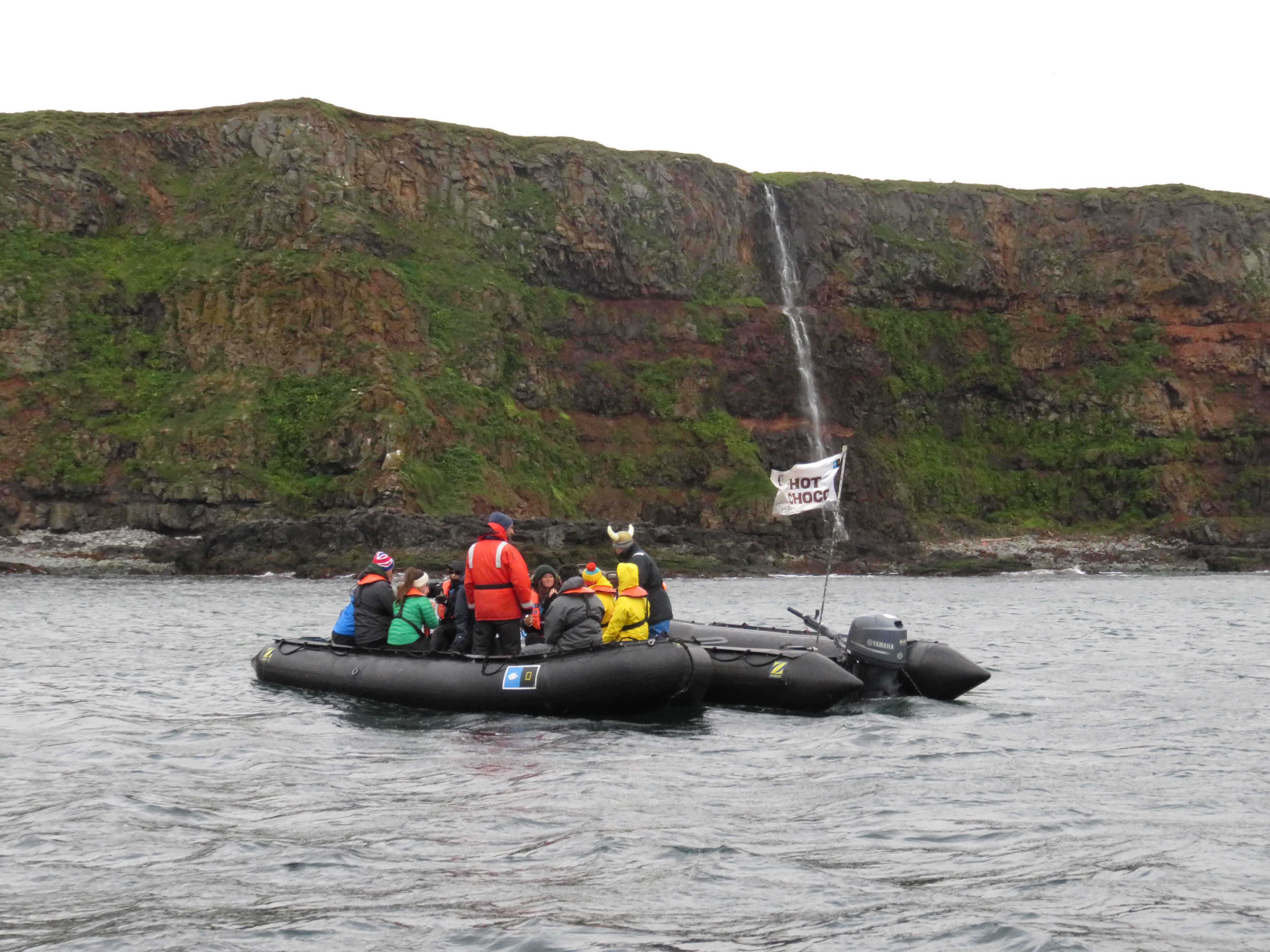 During our Zodiac tours we spotted a Viking boat, but these were not the fierce Icelandic Vikings, rather friendly Norwegian and Polish Vikings offering us hot chocolate—we were happy to see them.