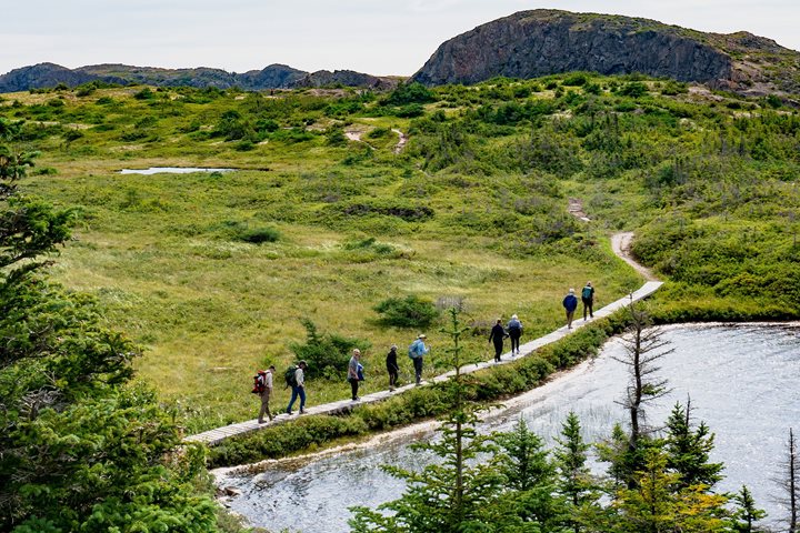 After days filled with dramatic mountains, fjords, ice, and wildlife, the Fabled Lands of the North expedition is drawing to a close. For our final shore excursion, we took Zodiacs to a sheltered beach at Spillars Cove, near Twillingate on Newfoundland's northeast coast. From a rocky pinnacle high above the beach, three ospreys–Mum, Dad, and Junior–watched guests disembark and navigate the cobble beach to a stairway leading to a system of trails. Some guests did a full circuit around the Spillars Cove promontory, peering down from jagged clifftops to sea stacks and sparkling water. The interior of the promontory is a sort of basin, and the restricted drainage has produced a small lake and surrounding bog. Gulls drifted overhead, and yellowlegs (wading shorebirds) patrolled the shallows in search of small invertebrate morsels. Bogs are low in nutrients, so some plants make up the shortfall by eating insects. The "pitcher" of pitcher plants contains water salted with enzymes that digest any insect that falls therein. Guests, not fans of biting insects, cheered the pitcher plants on.