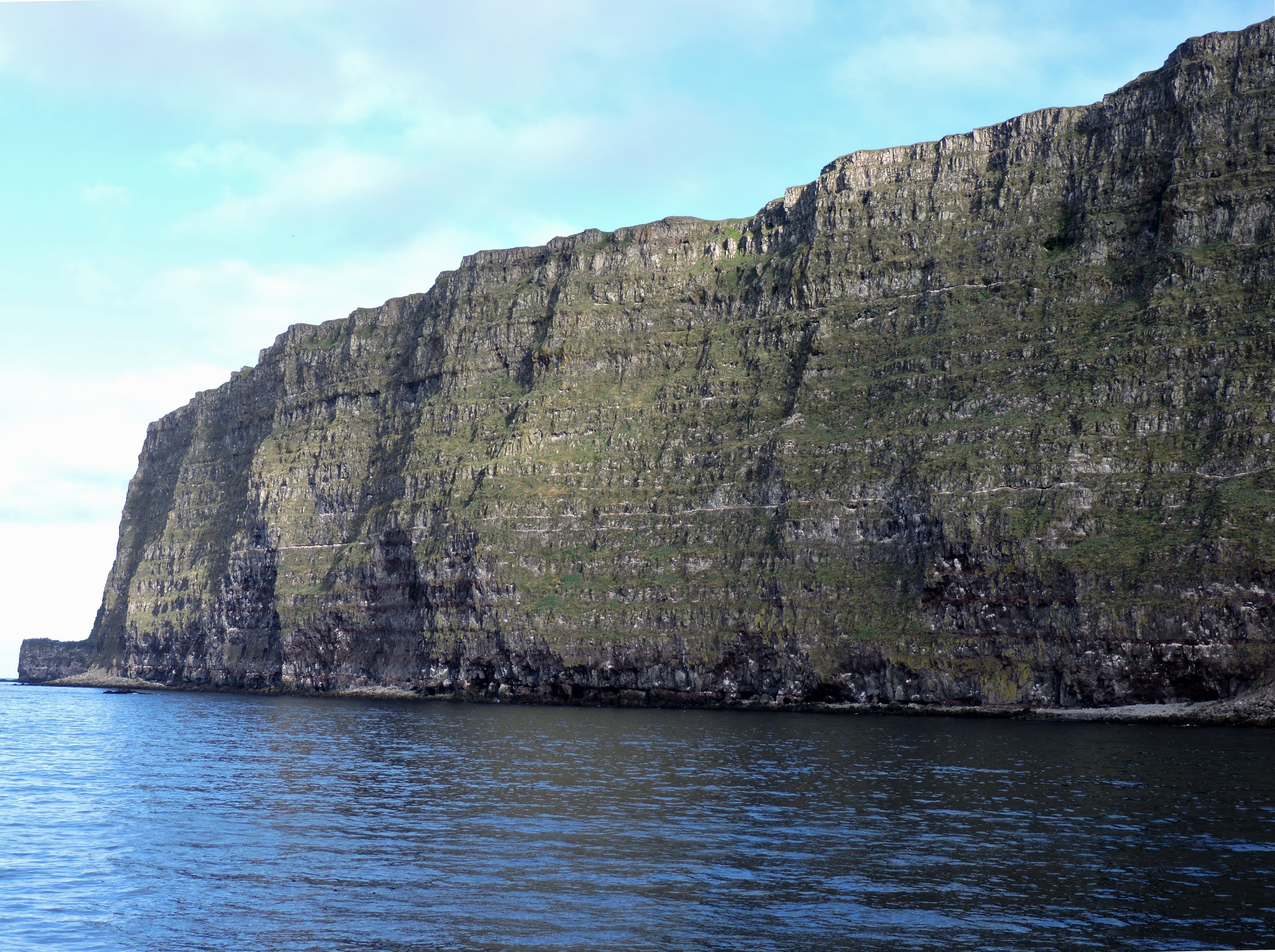 National Geographic Explorer reached the spectacular Latrabjarg Cliff of Iceland’s rugged northwestern region during breakfast. This is Europe's largest bird cliff…it measures about 14km (9mi) in length and rises to 440m (1,450ft) in height. These impressive volcanic cliffs are composed of ancient Tertiary basaltic outflows.  It has been formed by many separate layers of lava flows that can easily be seen from afar (Figure A). The interfaces of the adjacent layers have produced long, horizontal ledges that provide perfect housing to millions of nesting seabirds. Nearly 40% of the world’s population of razorbills nest here, as well as countless thousands of guillemots (or common murres), Atlantic puffins, black guillemots, fulmars, and kittiwakes. Most of the cliff nesters had already fledged their chicks by this time, and the nesting ledges were virtually empty today. However, many puffins, razorbills, and guillemots were observed swimming just offshore. In addition, there were plenty of northern fulmars, kittiwakes, and herring gulls in evidence. A few ravens were sighted high above the cliff face and several arctic skuas were seen chasing kittiwakes. For centuries, brave men were roped down on the Latrabjarg cliff face during the short bird breeding season to collect tens of thousands of nesting birds and their eggs for use as food and a source of oil.