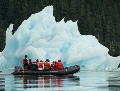 This morning we awoke in Frederick Sound to a beautiful day of sunshine and scattered clouds. We hopped into our expedition landing craft for a morning zipping around Le Conte Bay. Crossing the old glacial moraine of the Le Conte Glacier, we saw a smattering of bald eagles perched on rocks exposed by the low tide. The Le Conte Glacier originates in the Stikine ice field and flows 22 miles from its icy source to the sea, where it calves massive pieces of ice into the water. It has retreated ten miles from its moraine, exposing a deep fjord filled with large chunks of calved-off ice. We stayed at the entrance to the fjord to enjoy the impressive turquoise bergs glistening in sunlight and rolling as the salty water eroded their undersides. The variety of ice sizes and shapes delighted photographers, and a good time was had by all. A forest service cabin was visited on the shore and a mink was spotted running along the intertidal, looking both feisty and industrious. Many marbled murrelets peeped and dove around us, reminding us of the deep connections between their old growth nesting habitat and the sea.