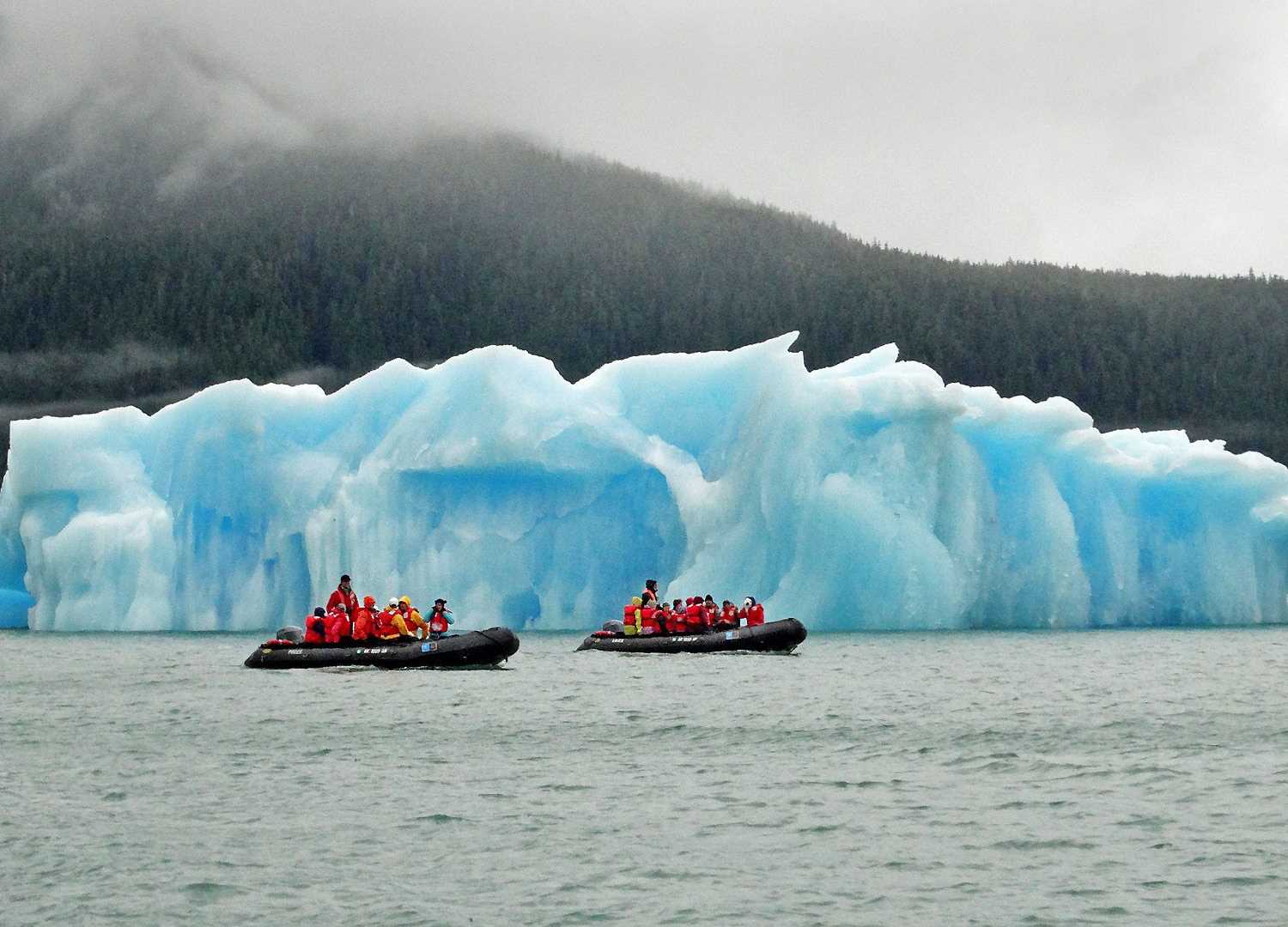 The mouth of LeConte Bay is shallow where ancient moraines rest just beneath the surface. Immense blue icebergs from the glacier far up the fiord run aground here, and after breakfast we set forth to view them at close range. During the afternoon we tied up at the dock in Petersburg where we could join the staff for a variety of outings, explore the town, hop on bicycles, or go flightseeing by float plane.