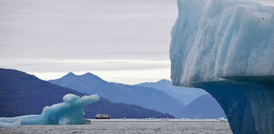 Early risers were treated to an atmospheric morning at the mouth of LeConte Bay this morning. Despite being tn miles from the front of the glacier, its status as one of the most productive glaciers (in terms of iceberg production both above and below water) meant the horizon was dotted with floating crystals of azul blue. As the tide drops in the shallow mouth of the bay, icebergs are left exposed above the water, creating a safe environment for Zodiacs to wind their way along an iceberg alley. Guests were treated to the many magical shapes and forms that icebergs can take. Snowfall high up in the Stikine ice field is compressed over many hundreds of years into ice which is then twisted and contorted as part of the glacier, before being ejected in the bay to be exposed to melting by the warmer water in the bay.
