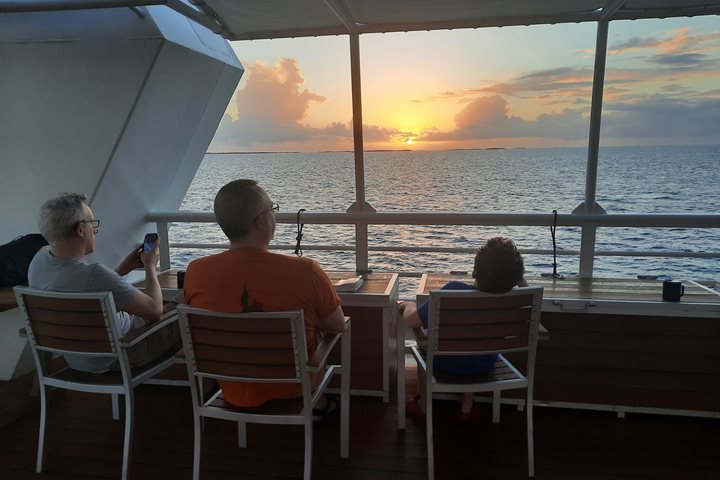 Today we woke up to a beautiful sunrise o n National Geographic Sea Lion in Belize. We are getting ready to do an inland activity that will take us to a waterfall to enjoy part of the day and the possibility to do tubing down a river called South Stan Creek River. It was my first time and I was very impressed by the natural beauty of the waterfall and the rock formation. We enjoyed about an hour at the falls then took a drive to the tubing site. We passed by land once used for growing oranges and bananas. At the private waterfall and river access, we did some swimming and tubing. Some guests saw scarlet macaws while tubing. It was a great expedition to the foot of a Mayan mountain. This afternoon, after a spectacular lunch, we rode Zodiacs to a place called the Yacht Club. Here we got the chance to enjoy a performance by the Garifuna Collective, a group that plays a kind of music known as punta. It was a fond farewell to Belize.