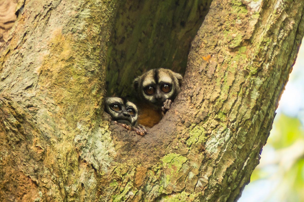 We had the joy to spot several species of the amazon primates in the trail. Squirrel monkeys, saddle back tamarins and the noisy owl night monkeys. This last ones, were found inside a hole of a tree. They peeked their heads out of the hole, curious to see the weird creatures that were approaching to their hiding place with cameras. What a treat!
