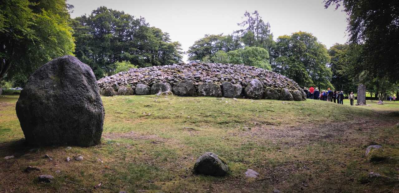 Onwards, and we heard from Stewart tales of Nessie herself, but on this occasion no monster was spotted by our naturalists. But many pleasure boats were on the loch and the canal, along with hikers on the towpath, enjoying the weekend sunshine. Soon we entered the final loch in the Great Glen, Loch Dochfour, and then the last stretch of the canal to Muirtown Locks and Inverness. After lunch, we departed for a visit to the remarkable Clava cairns. These Early Bronze Age chambered cairns were constructed about 4,000 years ago from a subtle variety of different-colored stones, and were aligned to the midwinter solstice, each surrounded by a magnificent ring of standing stones. A ring cairn marked a special place where cremations may once have been carried out.