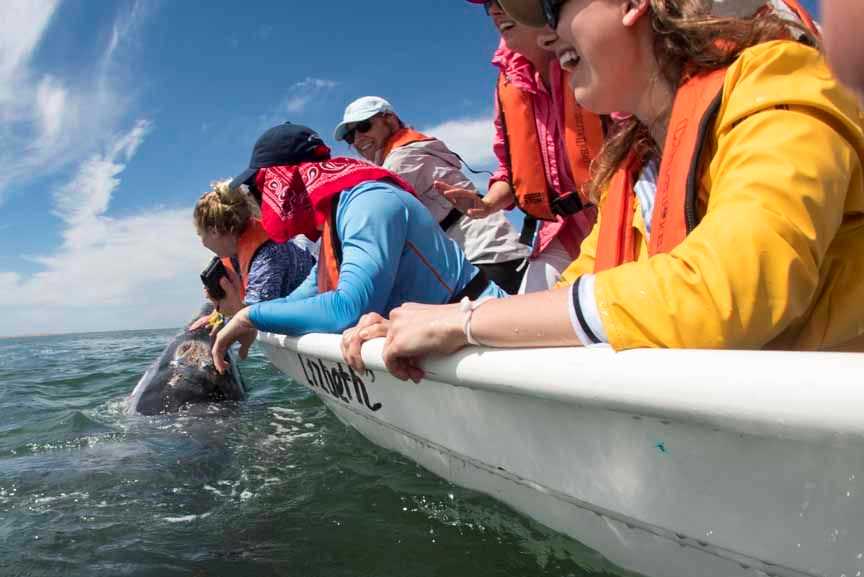 Both mom and her precious little one went from boat-to-boat and gave everyone a thrill as the calf lifted its head out of the water and let the very excited guests touch and stroke its rostrum. At one point, it seemed like some of our travelers might fall right out of the pangas in their over exuberance to have that contact with these amazing creatures! By the end of the morning almost all the guests had a chance to touch one of the calves as they went from boat to boat.