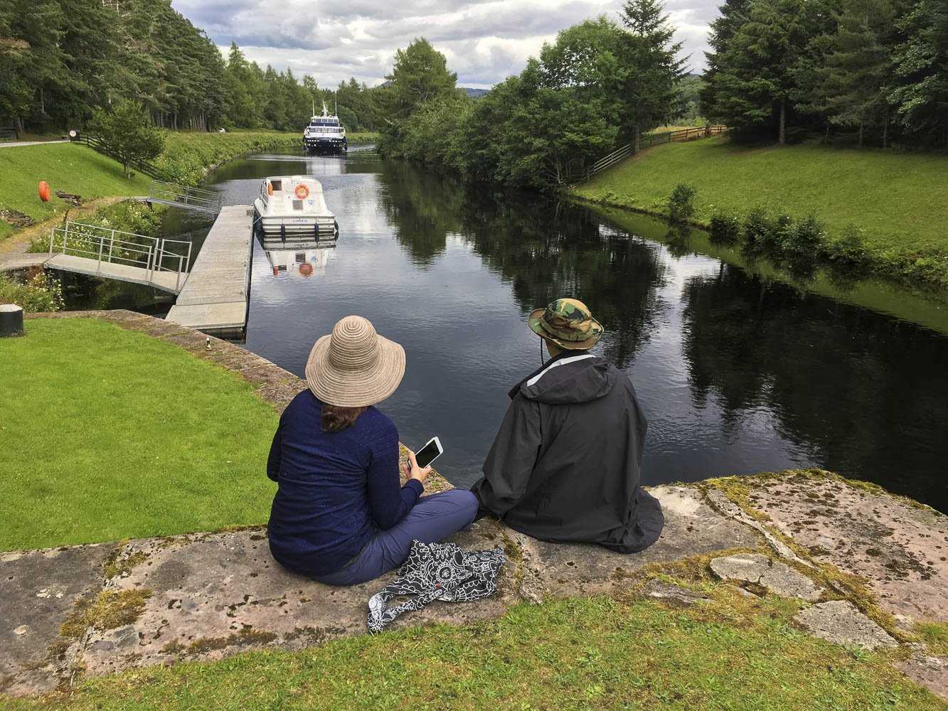 The morning dawned bright and sunny, all swing bridge mechanical issues were behind us, and we were free to enter our first lock on the Caledonian Canal to begin our ascent from Muirtown Basin. The cruise to Dochgarroch was delightful, as we made our stately way past the hill of Tomnahurich and its (perfectly operating) swing bridge, alongside pastures of the lushest green, lined with trees full of the sound of birdsong; ducks and ducklings scurried out of our path as the lock gates swung open, and roe deer bounded through fields of ripe wheat. Fly fishermen stood in the murmuring waters of the River Ness enjoying the tranquility of the morning.
