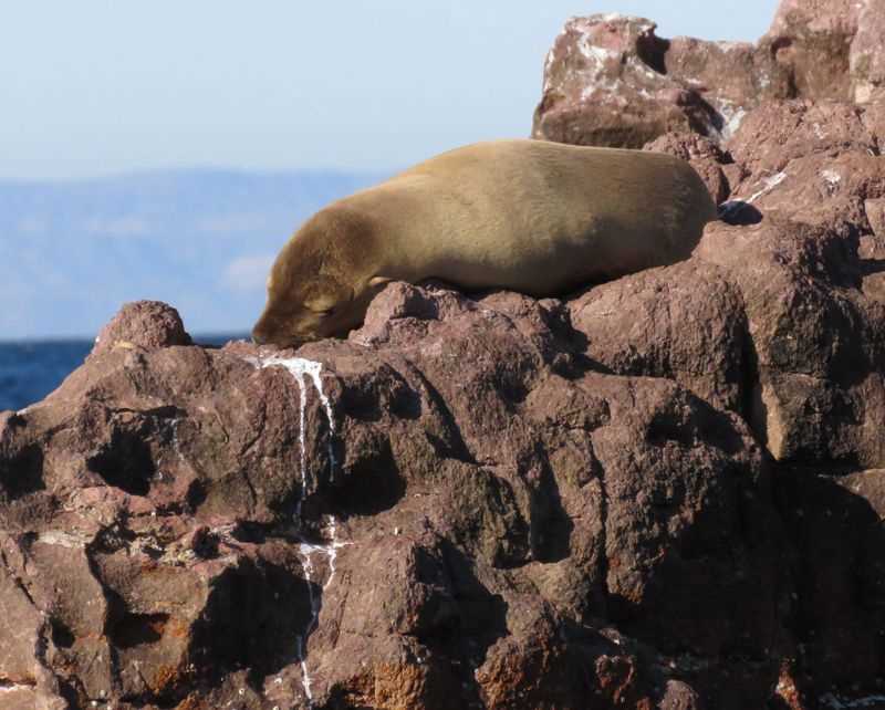 This morning the National Geographic Sea Bird arrived to Los Islotes, an established (and intensively studied) reproductive colony of California sea lions. As soon as we dropped anchor we boarded the expedition landing crafts and started cruises around the magnificent rocks to observe and photograph these interesting pinnipeds, as well as the many marine birds that perched on the cliffs or flew around in the clear sky. The year-old puppies came around the boats, and played and jumped out of the water, showing their great skills as divers and adaptations to the marine environment. Our guests and staff also snorkeled among them to see them below the surface of the sea. As a corollary for the exploration, the expedition diver took a long scuba diving to film the wonderful life that occupy the surrounding rocks, bottom and water column. In the afternoon, the ship moved to Bonanza Bay, a fantastic long sandy beach located in the southeastern corner of Espiritu Santo Island. Most guests enjoyed a relaxing time in the water: snorkeled, kayaked or played with the standing paddleboards; other, with the natural history staff, looked for the shy, beautiful endemic black jackrabbits, and spotted three of them running away from us. Our expedition in the Gulf of California finished with a red, orange, pink and greenish sunset.