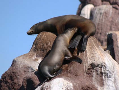 A beautiful clear sky accompanied by bright sunlight and a delightful temperature framed the entire Gulf of California this morning. The National Geographic Sea Bird moved through quiet waters from its nightly anchorage in a little bay of the western side of Espiritu Santo Island to the northernmost tip of it where a tiny islet, called Los Islotes, is located. On Los Islotes there is a small (400 to 800 individuals), permanent and reproductive colony of California sea lions, which is almost the only pinniped present in the gulf and certainly the most abundant marine mammal of its waters. We came to Los Islotes for snorkeling among these funny, beautiful, and agile creatures that once were on the verge of extinction as a consequence of merciless hunting. Under the protection of Mexico, the population recovered successfully and now the species is one of the top attractions near La Paz Bay.