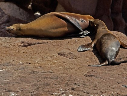 The barks of California sea lions greeted our early morning outing. The light was bright and golden against the white-frosted tops of the volcanic islets known as Los Islotes. Many of the sea lions draped over the brick-red tuff in deep slumber, while others argued and barked constantly. Several of the males faced each other, standing upright as high as they could on their front flippers, baring their formidable teeth and shaking their heads back and forth in threat displays. These never amount to much now, but in late May and June the land they stand on could have more importance than anything in their lives. These flat areas are favorite places for the local females to loaf and have their pups. The real estate is sought after because it’s close to water and has little commuter traffic that might crush a youngster. Two weeks after the pups are born, estrus will be upon the females and the local male is often the most convenient suitor. It is her choice.