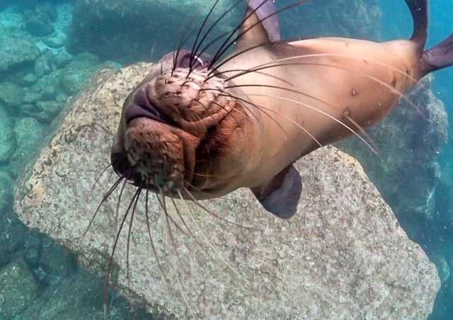 Our second full day exploring Mexico’s Sea of Cortez started in a gorgeous way with a beautiful sunrise that painted not only the sky, but the islands and the peninsula of Baja California, with great colors. We thought that it is possibly true that those early Spaniard explorers from the 1500s named this place the “Vermillion Sea” and the “Red Sea” after the impressive sunrises and sunsets here. Shortly afterwards we arrived to Los Islotes, which was our morning destination. Los Islotes is one of three islands that are part of the “Espiritu Santo Island-Complex Biosphere Reserve,” part of the Natural Protected Areas network that Mexico has put together. That reserve is also world-famous for the colony of California sea lions that call Los Islotes home, and being fairly close to the capital city of La Paz, many people visit them. And that’s exactly what we did immediately after breakfast! We got our snorkel gear, donned our wetsuits, and jumped into the water to admire and interact with those awesome creatures. Oh my lord, they are fun! Visiting them underwater is the best way to really appreciate how marvelously adapted they are to the marine realm, and I have to admit that I always get jealous of their swimming and diving capabilities. We also visited them using our Zodiacs and got the chance to observe them from a different perspective as they rested, socialized and vocalized on the rocks.