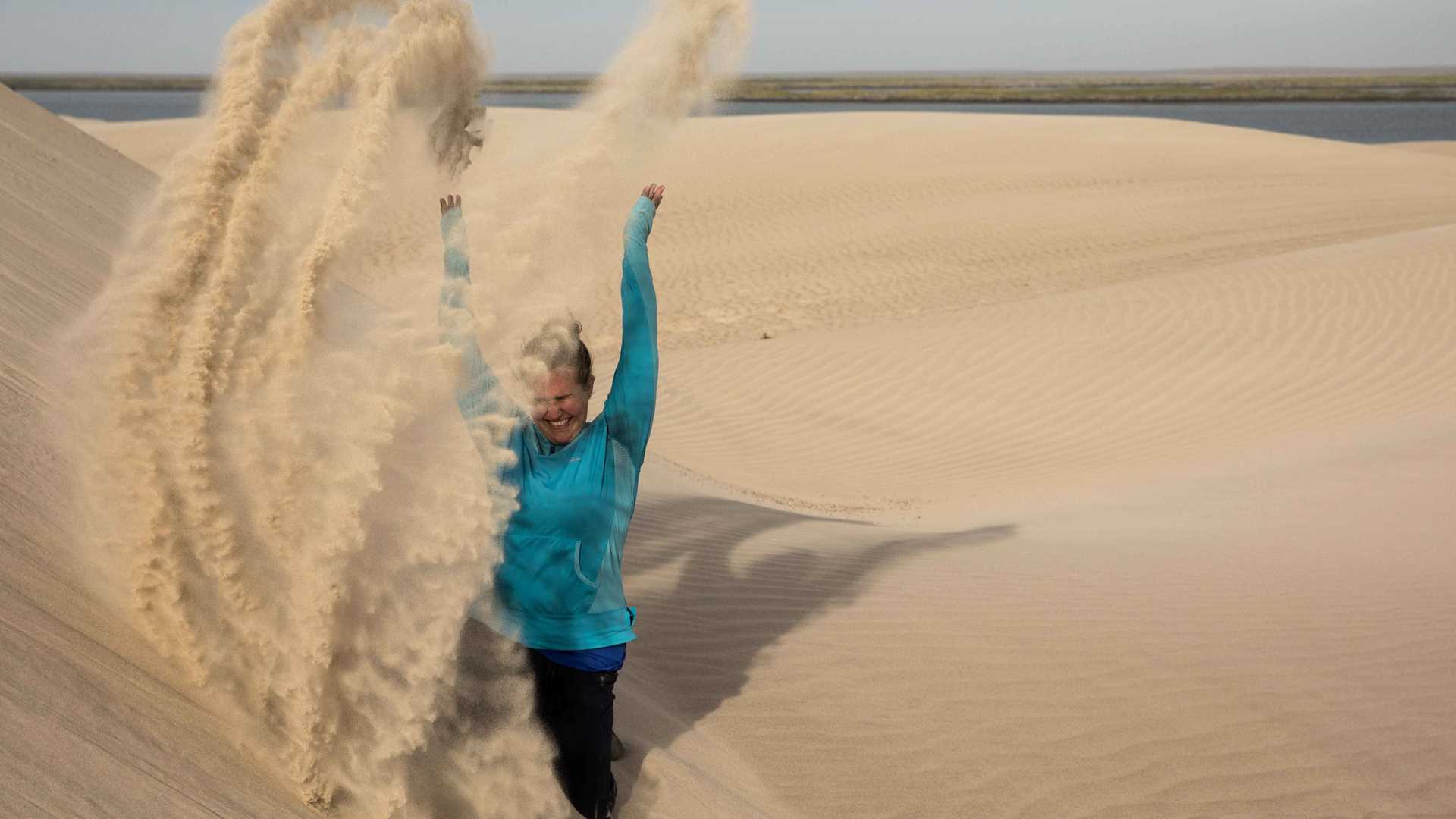 After a long night of cruising, we finally entered the protected waters of Magdalena Bay around 10:45 in the morning. Directly in front of the fishing town of Puerto San Carlos, our pilot Sergio, joined the vessel and helped us navigate through the narrow Hull Canal. Amongst the mangroves we saw numerous birds and even a wandering coyote. A couple gray whales were observed from deck as we headed north to our anchorage. Fortunately, we made great time and were able to disembark and run around the breathtaking sand dunes for an hour before returning to the National Geographic Sea Bird for dinner.