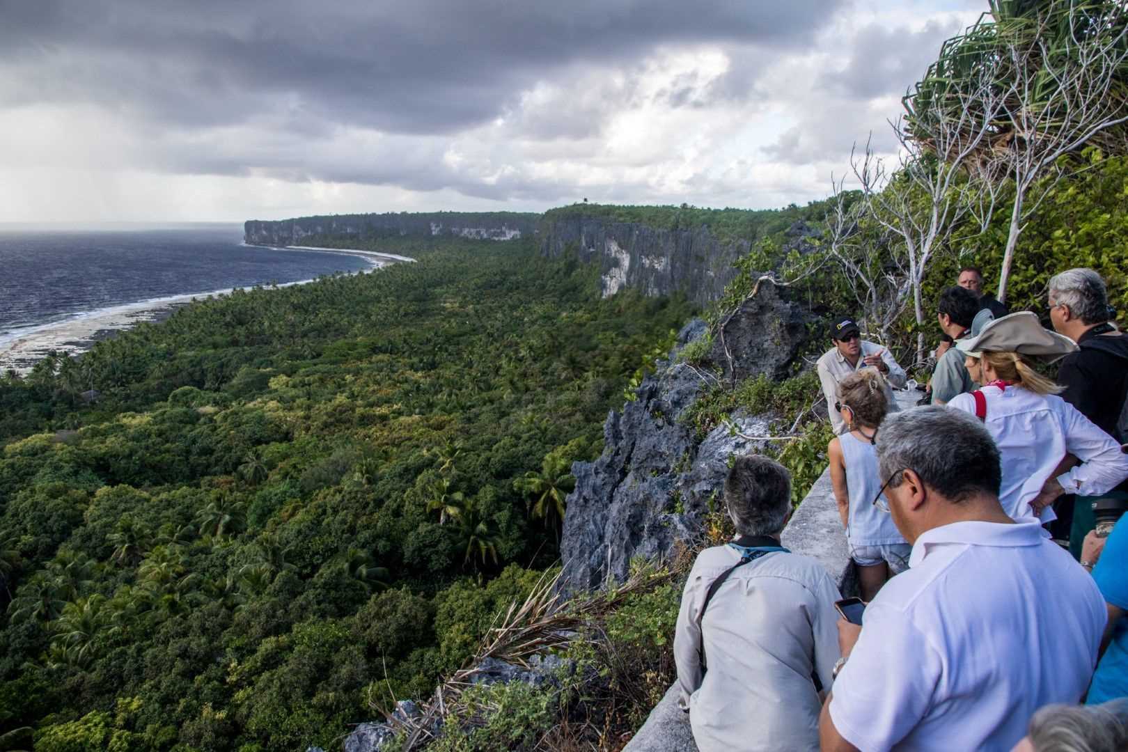As the sun rose, National Geographic Orion navigated around the spectacular sun kissed cliffs of Makatea towards the old harbor. This derelict harbor was once thriving with industry associated with the phosphate mines, which cover the island. The day’s activities all included a trip to the lookout point which allowed us to view these uplifted coral cliffs from above. From here, guests ventured down to the freshwater grotto whilst keeping their eyes peeled for the endemic birds unique to the Tuamoto’s. The grottos were a highlight for all as most opted for a dip in the rejuvenating waters with masks and underwater flashlights allowing us to take in the stalactites and stalagmites that line the caves interior.