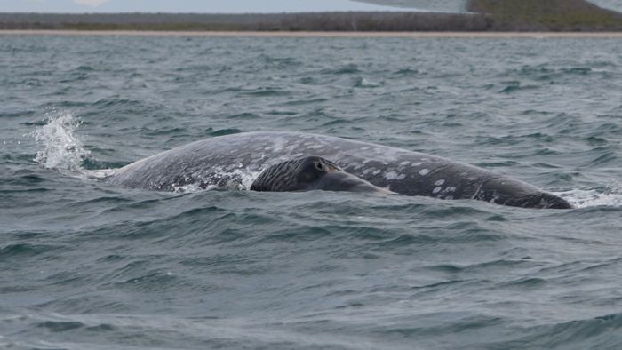 This morning, National Geographic Venture docked at the interesting port, San Carlos. From the 1940s to the 1990s, the port was used for loading agricultural products and fertilizers from the nearby Santo Domingo Valley. Nowadays, San Carlos is basically a place for loading sardines from a local cannery. It is also an important tourist base for whale-watching, principally mating gray whales. At the port, all guests and staff boarded buses to Lopez Mateos, a town located near the northernmost tip of Magdalena Island. The buses traveled across Magdalena Plain, a section of the Sonoran Desert that receives a lot of moisture in the form of dense fog from the Pacific Ocean. Lichens and orchillas, a type of flowering plant, give the desert a phantasmagoric appearance. Guests and staff enjoyed spotting numerous birds, including crested caracaras and kestrels. Once in Lopez Mateos, we boarded local pangas for whale-watching. During two rounds of whale-watching, we encountered several whales close to our pangas. However, most of the whales were preoccupied with traveling, searching for mates, or just finishing their time of reproduction and thus exiting the lagoon. In reality, the whales were not interested in interacting with the boats and their excited cargo, but we had many opportunities to observe the behavior of these magnificent animals. In town, we all delighted in a delicious fish lunch, ‘pescado zarandeado.’ We enjoyed exploring the local dock with its many colorful shops and crafts, and we admired the wonderful sculpture of a cow-calf pair of gray whales.