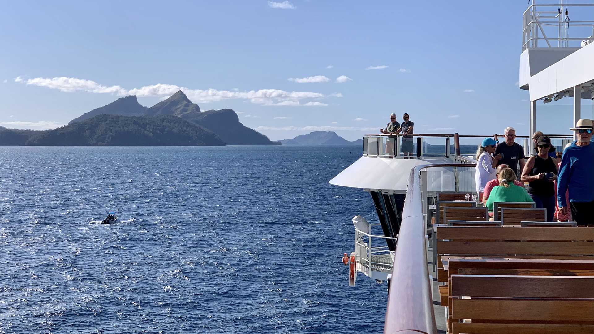 As soon as National Geographic Resolution was ready to get back on track, we set our navigation course to Pitcairn Island. During our navigation, we enjoyed lunch on deck with amazing views of the fringing coral reef and the idyllic, clear turquoise waters that surround little islands covered by coconut palm trees.
