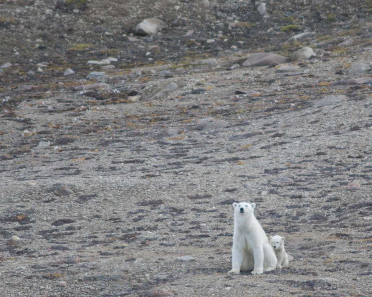 Sailing west the scenery just keeps getting more and more stunning, the light and the flat calm seas makes for fantastic photo ops, and more than one SD card is filled this morning. While we are cruising along, a guest spots a black spot on an ice flow. This turns out to be a very relaxed bearded seal, that, with a bit of “sneaking,” lets us come very close. While we are enjoying the seal, someone spots another polar bear on the far shore, so we head on over. And here we have a mother bear and her two cubs, just relaxing in the warm weather just above the beach. Again our amazing bridge team with Captain Skog in command “sneaks” our way closer, they must be the best in the game, because they manage to slip the ship as close as was physically possibly (and here I mean every word! They put the ship on the beach on purpose to gain those last feet!) and even with the National Geographic Explorer and 150 cameras clicking, the mother bear only sat there and looked at us, while her cubs stayed close to their mother. Yet another fantastic encounter under our belt!