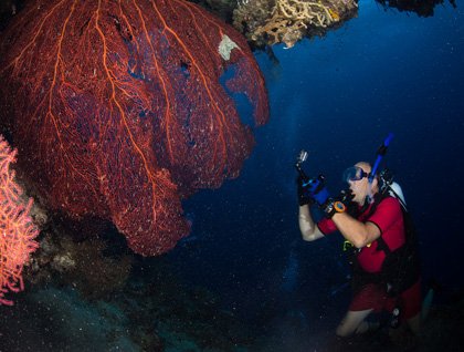 Gray skies may deter some, but expedition diving does not stop when the clouds come in. Slowly squeezing through Lumalihe Passage into Marovo Lagoon, National Geographic Orion anchored out of the wind and swell amidst a maze of tiny islands and coral reefs near Vanguau Island in the western region of the Solomon Islands. With exploring on our minds, dive master Ian and I found a promising reef wall outside the lagoon on verdant Sambulo Island. We relayed the scouting report to our eager guests, so it was time to gear up and head out on a morning dive while others went to the local village to sample their wood-carving wares.