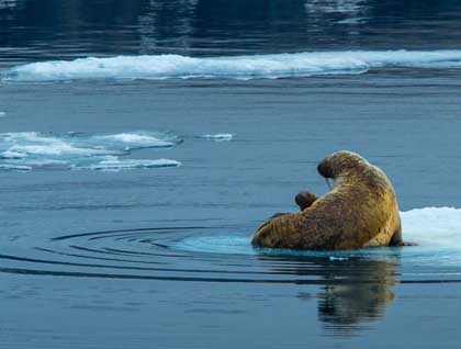 The waters of Lancaster Sound lap the southern shores of Devon Island where we spent the entire day observing a wide array of Arctic wildlife. Tracking along the coast, our first sighting was two walruses lying beside each other on a small ice floe. These are gregarious and tactile creatures. Their latin name is Odobenus rosmarus, the former meaning “tooth walker,” deriving from the animal’s ability to haul itself onto ice floes using its two tusks. Highly sensitive whiskers locate molluscs living in sediment on the sea bottom. Interestingly one of the animals was missing one of its tusks. These canine teeth have been much prized for centuries. In Medieval times Viking traders, who plied these waters brought walrus tusks to Ireland, Britain, and Mainland Europe. Here they were fashioned by highly skilled craftsmen into a variety of high status items. Harp seals were present in abundance with groups at a time surging in the water among the ice floes. In addition a large bearded seal reclined on a floe and “posed” for photos. But the best treat was what we thought was a lone walrus on a chip of ice, but as we got closer, the tiny head of young calf emerged from the mother: walrus Madonna and Child!