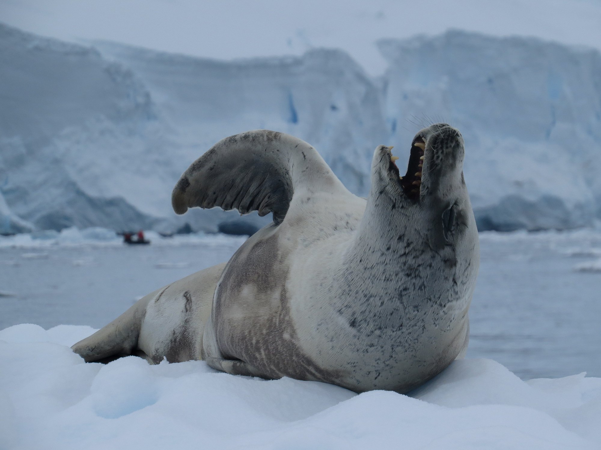 Christmas day in Antarctica was definitely not a disappointment. The morning started with a landing at Mikkelsen harbor to visit a small island teeming with nesting Gentoo penguins and an unlikely welcome visit of elephant seals relaxing in the middle of the colony! As well as the landing we were able to take advantage of a kayak around the bay enjoying flat calm seas and crystal clear waters allowing us to see the seabed several meters below. After this we departed for Cierva Cove. As had become tradition our initial plans were scrapped when we discovered a pod of type A Orcas, the top Antarctic predator and largest Orca species in the world! One particular orca was incredibly inquisitive and was seen for around 10 minutes swimming by and rolling under the bow of the ship. We were eventually back on track and arrived at Cierva Cove in time for a spectacular ships cruise to a large glacier and zodiac cruise to wildlife and icebergs.