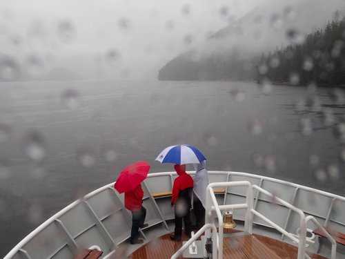Shall we say rain? And more rain? And wind? Yes, we shall, for this was the day to cap the week off with a thorough deluge. A few brave souls bundled up in every shred of clothing on hand and stood on the bow, bending into the wind and wishing for goggles to protect their eyeballs from the driving rain. The morning continued thus, with all eyes scanning the beach for any sign of wildlife. Cliffs emerged through the fog–sheer, shimmering in gauzy mist, accented by tumbling rain-born waterfalls. We sailed through the "punchbowl," a deeply scooped rocky bowl filled with seawater and continued on to the end of the inlet. A couple of presentations gave us a break from the outer chill–a photo presentation by our National Geographic photographer Dan Westergren and a historical journey through Alaska's post-oil age by naturalist Steve Maclean.