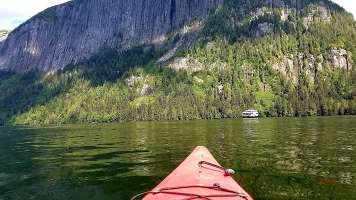 After a pleasant brunch prepared by the talented staff on board, guests readily embarked in another afternoon of exploration, this time to a remote area known for its grand presence. Sculpted by the staggering force of glaciers, Misty Fjords National Monument welcomed those of us aboard with immense rock walls, lush vegetation, and ribbons of waterfalls, which paired perfectly with the continuous and united sense of exploration found among guests. With the sun shining, zodiacs cruised past Sitka spruce, red cedars, and western hemlock trees as kayakers maneuvered about the stellar waters, all in search for more wildlife and natural wonders within the Tongass National Forest.