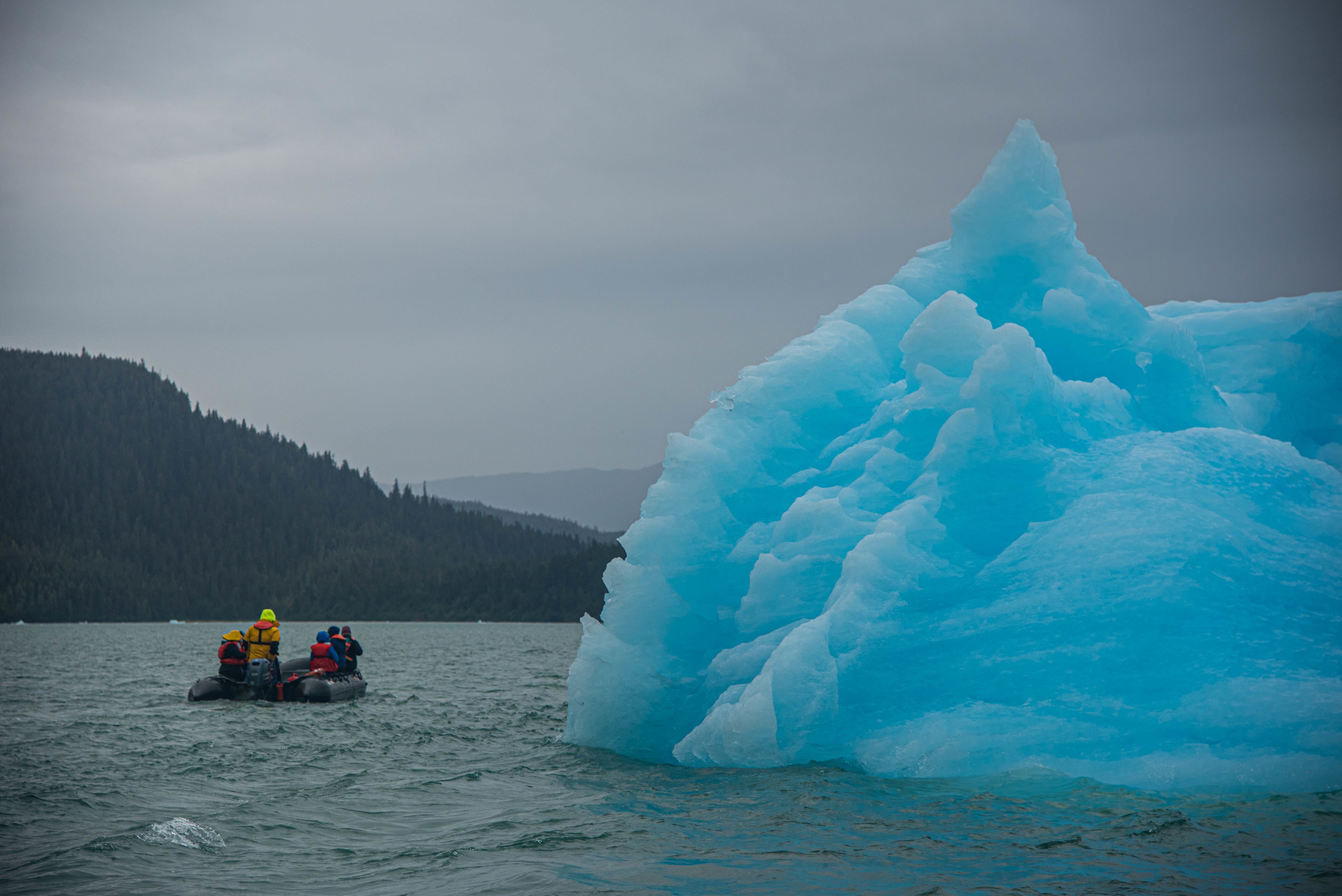 We continued to the end of the fjord and set the anchor. Our activities this morning included kayaking and DIB cruising to admire the grandiose scenery. There were many bald eagles, harbor seals, a mink, ribbons of water plummeting from thousands of feet above, and a glacier-sculpted image of an owl overlooking the narrows at Owl Pass. The lush and verdant forest was dense with western hemlocks, Sitka spruce, and cedars clinging tenuously to precipitous slopes. Alders and other shrubs fill avalanche tracks, and myriad mosses, ferns and lichens cover all available space.