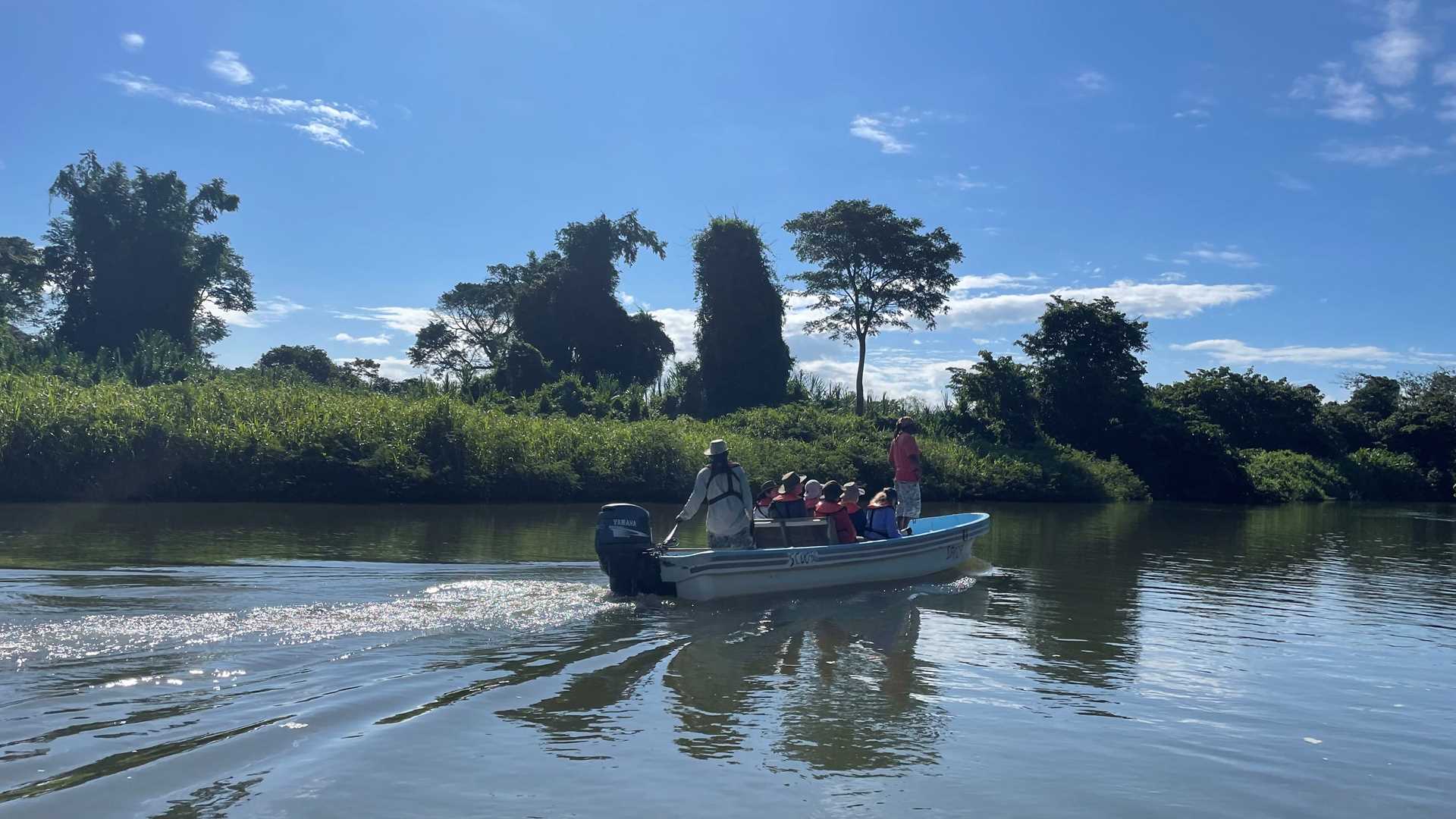 We woke up early this morning to venture upstream on the Monkey River. Our early morning start gave us an opportunity to view wildlife during the most active time of day, just after dawn. Starting in Monkey River Town, we picked up our guides who expertly navigated the shallow river while pointing out shore dwelling birds and iguanas. Farther upriver, we heard what sounded like dinosaurs in the trees. We slowed our motors and viewed a whole troop of howler monkeys feeding. Male howler monkeys have an enlarged hyoid bone in their throat that amplifies their voice, making each “howl” identifiable for miles around.