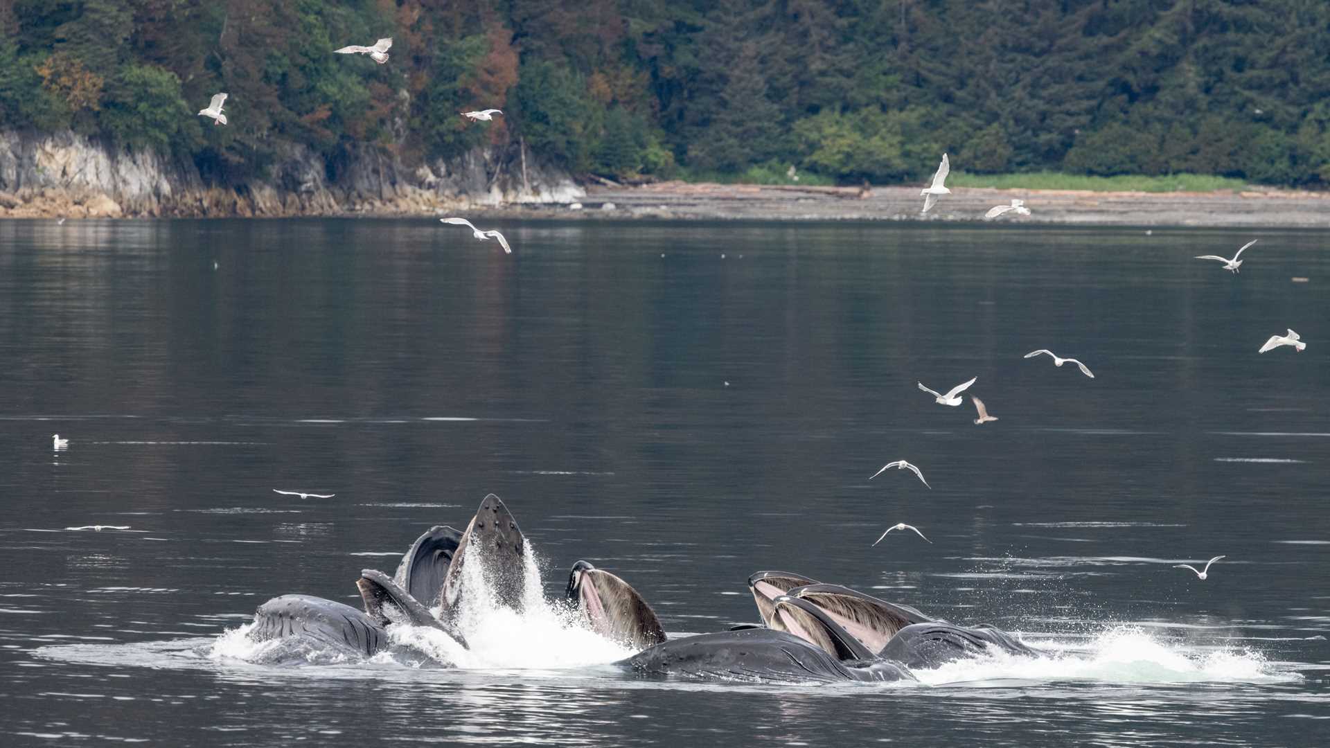 Throughout southeast Alaska, thousands of these 45-foot-long animals seek out schools of herring and other small bait fish, as well as masses of tiny krill to scoop into their giant mouths, filter out with rows of chitinous baleen, and swallow. Here, at Morris Reef, a few of a few score of these giant whales engage in something no other whales in the world do: cooperative, bubble net feeding.