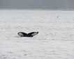 The whales remain near the surface alongside the ship, taking a handful of breaths before throwing their massive tails into the air to dive back down, regroup, and do it again.
