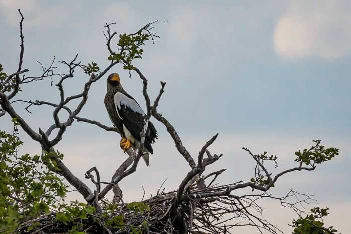 A simply delicious day on the Kamchatka Peninsula began with a bear sighting followed by our first glimpse of a Stellar sea eagle! This was to be a theme for the day, and we began our walks ashore at Morzhovaya with appropriate caution and excitement. Thankfully no bears witnessed on shore, but many signs were found and rare birds spotted. The afternoon led to our repositioning to the Zupanova River where the Zodiacs were deployed for an extended cruise and low and behold if we didn’t get a phenomenal look at a coastal brown bear and great views of the legendary Stellar sea eagle. The volcanos of Kamchatka watched over the proceedings and peacefully smoldered on the horizon.