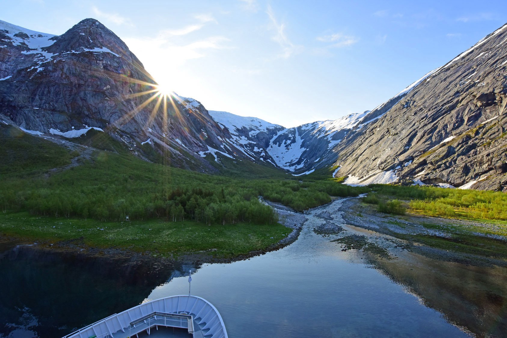 In the early morning National Geographic Explorer smoothly cut the glassy surface of Melfjord, a very scenic fjord in the county of Nordland. We were heading for Svartisen National Park, which extends to the bottom of Nordfjorden, a branch of the Melfjord. Svartisen means "black Ice" and is one of the largest icecaps of the Norwegian mainland. A number of glaciers spill off the icecap, including at the location where the ship had anchored, close to the inner shore of the fjord. This shoreline forms part of the border of the national park. Just as we arrived, the sun peeked over the horizon up above.
