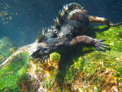 The afternoon and a short navigation brings us to Rabida Island. Incense trees dot the terrain on a bright red volcanic background and some are surprised at the drastic change from our morning visit. Exploration of the undersea world ensues with snorkeling from the beach and the Zodiacs along the coast. The occasional pacific green sea turtle pops its head up as they take a breath of fresh air enter into the calm water. The occasional school of fish passes as we start to concentrate on the details of this otherworldly realm and we notice a marine iguana feeding on algae a couple of meters underwater. A white-tipped reef shark gracefully swims past with razor surgeonfish grazing upon the shallow reef. As we concentrate more we notice small blennies poking their heads out of abandoned barnacles awaiting food to pass by. Brightly colored sea anemones and panamic sea stars add color as a Galapagos sea lion swims past, considering if we are worth the time to play with. In the late afternoon we eventually land on Rabida and have a chance to hike and explore the coastal area. As the sun dips into the distant horizon, the light paints an interesting picture upon the sea lions that are lazing on the beach. A flycatcher flits among our group and Galapagos mocking birds fight over territory. Small mollusk shells are found underfoot and as the light of this day dissipates we are rewarded some insight into this continuous struggle for existence for life with us being a prime witness.