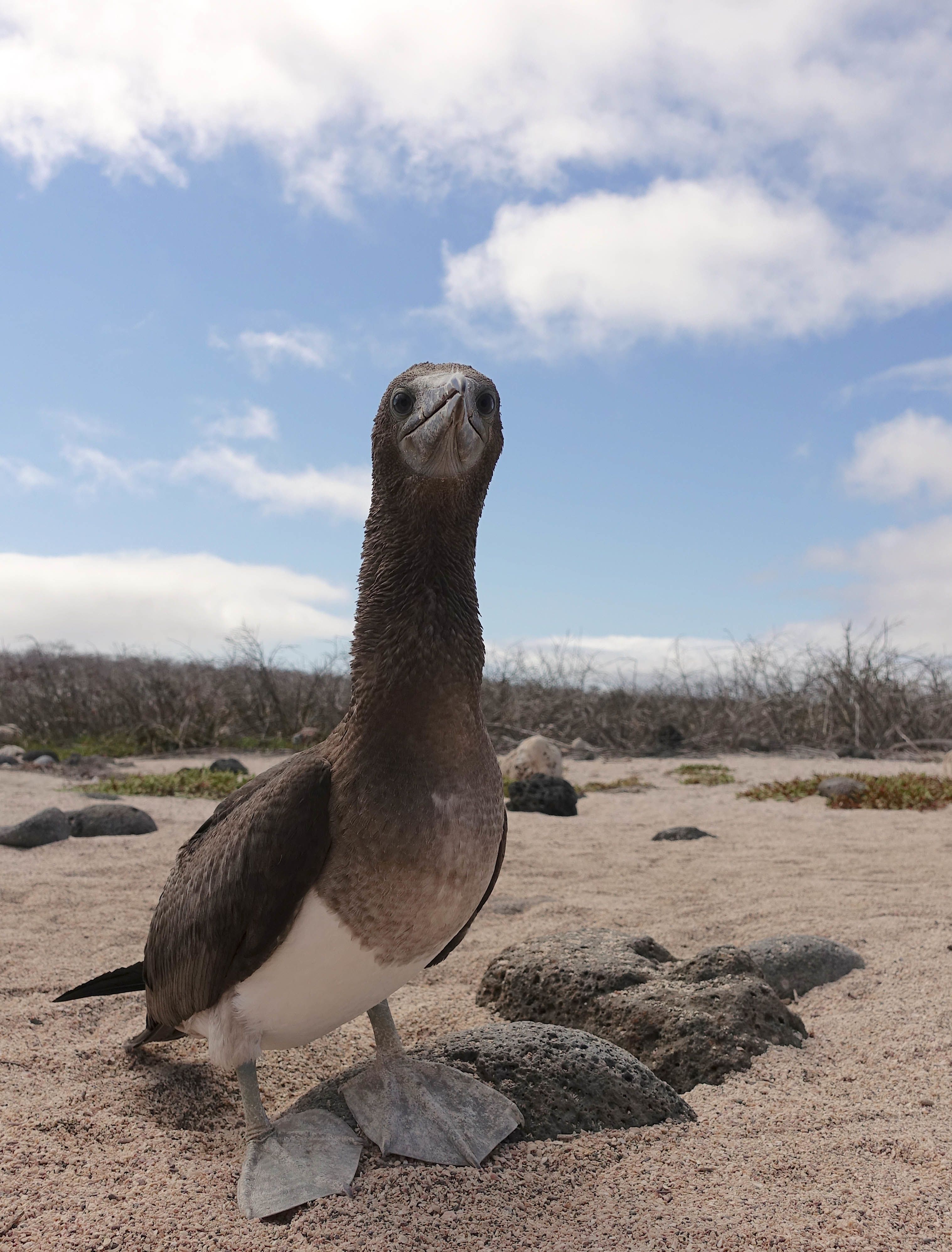 A grey sky looms overhead as we awaken off North Seymour Island in the central part of the archipelago. We float upon turquoise water as we start to move towards a landing, and the blue sky starts to appear overhead. Boulders underfoot as we pass through a dry environment. We find male frigate birds with inflated gular sacs trying to find mates, blue footed booby chicks awaiting food and land iguanas starting to move to the shade as the sun heats the land.