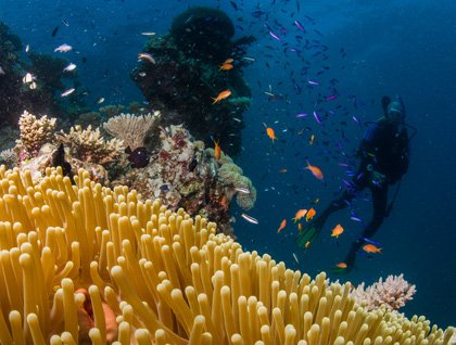 There was certainly something different about the reef we experienced today. The number of large, predatory fish we encountered was more than we’ve seen the whole trip. On most coral reefs, including most of those we’ve visited thus far, large and/or predatory fish are the first denizens to be caught by humans, throwing the whole ecosystem out of balance. The massive humphead parrot fish, traveling in schools and looking like the buffalo of the reef, have been conspicuously absent. Until today. Feeding on the coral itself, these fish are responsible for much of the white sand we spent the afternoon relaxing on and are important players in reef health. Some snorkelers, divers, and cruisers also had a great look at bumphead wrasses, sometimes called Napoleon or Maori wrasse. Nearly every Indo-Pacific reef should have this huge teal fish, yet their numbers are on the decline as they’re a valuable fish in the live-seafood trade in Asia.