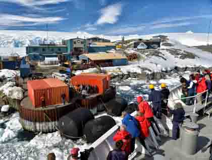 Our extraordinary journey to Antarctica continues. This morning we woke up to a magnificent view of Orne Harbour, comprised of tall mountain peaks, glaciers flowing seaward, fresh white snow, and glittering reflections in the waters of the Gerlache Strait. Blue-eyed shags were seen flying across our bow. After breakfast we made our approach to our first landing, half the guests decided to go Zodiac cruising, and the rest made the 245-foot hike up the steep and snowy hill to Spigot Peak. On the occasionally steep metamorphic rock, we saw several hundred pairs of chinstrap penguins sitting on their nests partially obscured by snow, as well as the occasional south polar and hybrid skuas. From the peak we had the chance for amazing panoramic photos of the Errera Channel, barely a cloud in sight. Also we had great views of the ship nestled in amongst the brash ice while the small Zodiacs motored through.