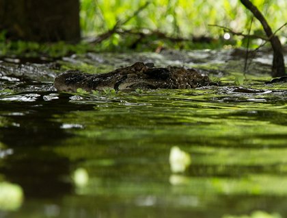 After exploring the Pacaya River for second time and finding more wildlife, we stayed out until dark and our local guides took out their spotlights. Crocodilian's eyes shine red in the dark. The eyes of many other creatures ranging from spiders to birds and reptiles can be easily detected with a spotlight and experienced vision. Our guides found numerous spectacled or white caimans; mostly juveniles. Later on, on our way back, a third large black caiman was found. We had a glimpse of the reptilian beast, until it splashed in the water, leaving a powerful turbulence behind.