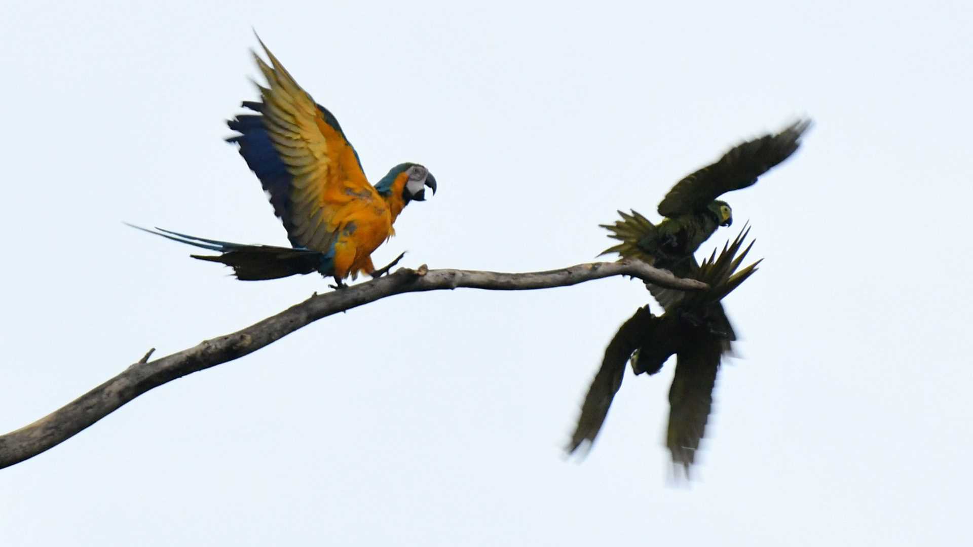 In the afternoon our experienced captain of the Delfin II motored to reach the Dorado River, and at 4:00 p.m. we went to explore it. The afternoon was sunny and rainy. Here it is very common that it rains for a bit, then stops for few minutes, and then rains again. Nothing can stop our adventurous spirits though, and the early birds got their worms. We found many kind of birds, monkeys, a mother sloth hanging with it baby in its arms, and at the end we saw a flock of blue and yellow macaws perching on the branches and flying around.