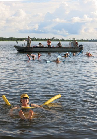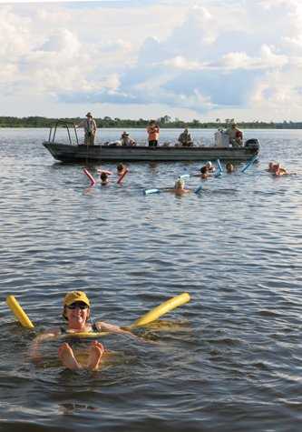 Our afternoon destination was to go all the way up the Pacaya to Yanayacu Lake and beyond. Along the way, rangers flagged us down to show us a large anaconda they had found. At the lake we swam (or floated with colorful noodles) while the pink dolphins made closer and closer passes. After a swim and a beverage we went a little further upriver to get into the habitat of the red howler monkeys. As the day was ending we suddenly could find howler monkeys everywhere. Several groups were spotted in the tops of the tallest trees. Their reddish coats were highlighted by the late afternoon sun.