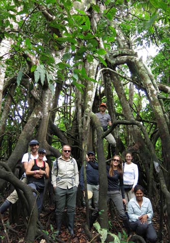 After breakfast we put on our boots and headed out into the forest. It was fun to walk through the forest that in a few months will be flooded as part of its annual cycle. As we walked the trail we could see marks high above our heads on some of the trees that indicated the height of the water during the flood season. The most impressive of the trees we saw was a large strangler fig with roots that towered above our heads like stilts or maybe the framework for an elaborate building. Whether with stilts or buttresses or just a straight “normal” trunk, all these trees have one thing in common. They are all specifically adapted to not only survive but thrive in a flooded habitat.