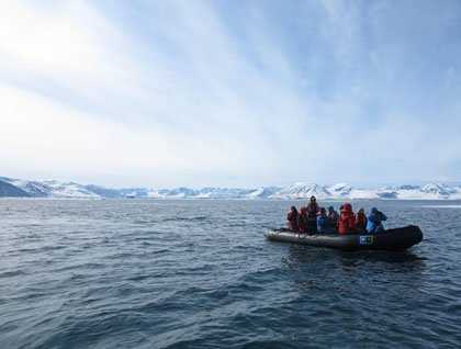 As we were dropping anchor and getting ready to start our afternoon Zodiac cruise we spotted a polar bear on one of the Andøyane (Duck) islands. The bear was raiding eider nests, which is not uncommon as sea ice diminishes, forcing bears to find food in other places. Since the polar bear was on land, we chose not to stress it more, so we did Zodiac cruises around the neighboring islands. We found some walrus hauled out on sea ice, and some in the sea swimming around the Zodiacs. Together with bearded seal and birds (king eider) this was a great Zodiac cruise. This great day ended with the ship cruising out from this beautiful fjord with a spectacular view of the surrounding mountains.