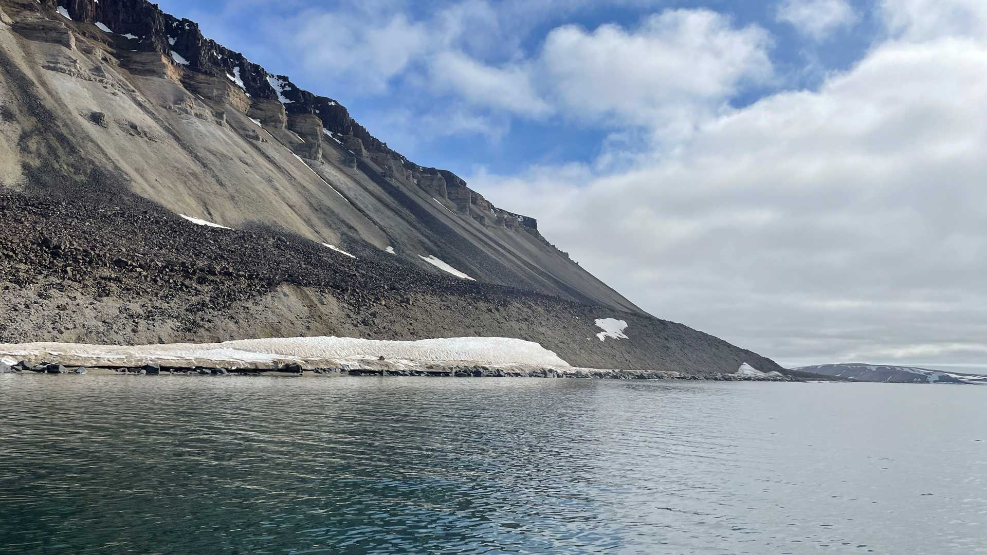 After reaching a maximum latitude of 81.25 degrees North, the farthest north National Geographic Endurance has traveled in her time at sea, we spent the night cruising southward toward Nordaustlandet. In the morning, we were greeted with a drastic change of scenery. Expansive, butte-topped sedimentary mountains gave way to long fjords. Here, bits of sea ice came into view as we made our way to Palanderbukta.
