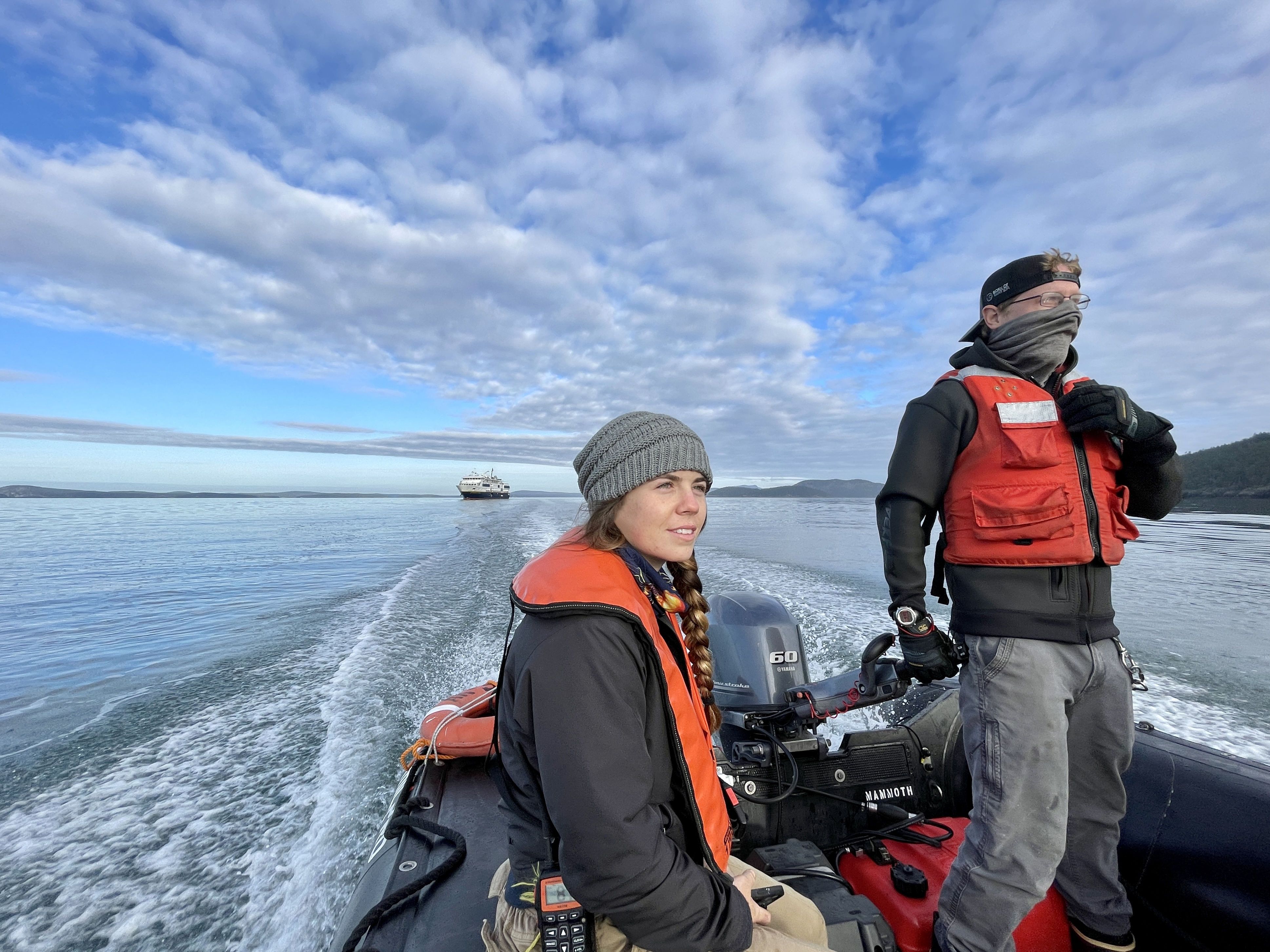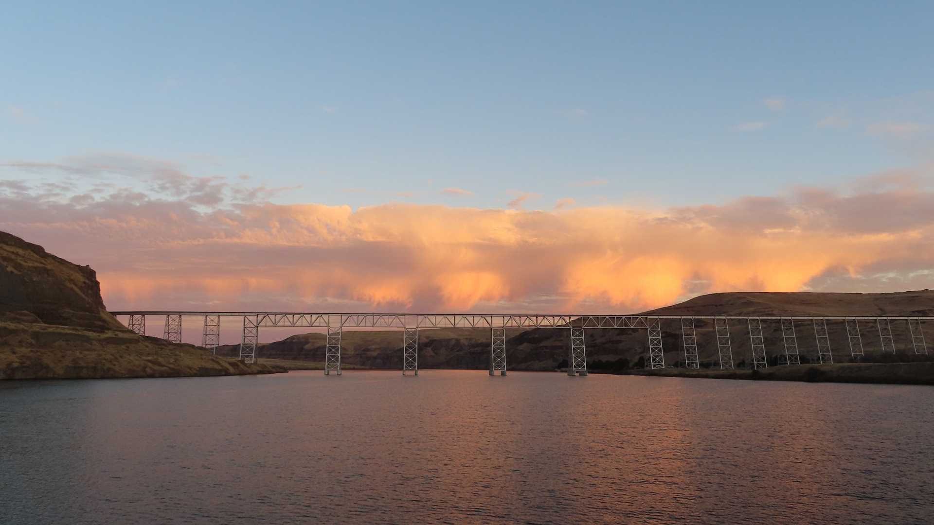 The slimmest of crescent moons hangs low in the east as National Geographic Quest makes her way downstream on the Snake River, bound for its confluence with the Palouse River. We are in the heart of the Columbia River Basalt Province, and layer upon layer of basaltic lava flows step up, forming high cliffs on either side of the river. The buff grasses of autumn contrast beautifully with the brown-weathered basalts. A pair of great blue herons fly high above the river as the rising sun turns the few clouds vivid pink and orange. Soon we arrive at the mouth of the Palouse River and begin our day of adventures, visiting Palouse Falls and taking Zodiac cruises up the river. We also launch our fleet of yellow kayaks, a popular option.