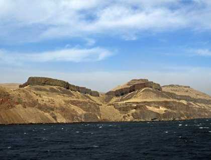 Anchoring in the Palouse River we find the wind has not abated, but has freshened and we have a condition called “sea smoke” as the tops of the waves are being whipped off and sent downwind in a fine spray. It is soon determined by Lee, our expedition leader, that conditions are too dangerous for inflatable landing craft expeditions so we haul up the anchor and sail back onto the Snake River. Now we enjoy some sunshine as we sail along with a following wind, making conditions on the bow very pleasant indeed. We enjoy the passing scenery of brown basalt cliffs trimmed out with the buff grasses of autumn, giant gravel bars deposited by the great Ice Age floods, intricate and beautiful patterns made by the weathering of the rocks on the hillsides, and “Ship Rock” (now called Monumental Rock) named by Lewis & Clark when their Corps of Discovery passed this site on October 14, 1805.