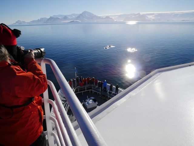 Today started a little earlier than scheduled, but 6 a.m. is a welcomed wake-up when the call is to come outside to watch killer whales. After we said goodbye to the whales it was time for breakfast before heading back outside for Zodiac tours and kayaking in Paradise Bay. With the calm seas and bluebird day it seemed foolish not to take the polar plunge. For a normal day this would be full enough but not in Antarctica—the day was only half over! Next, we headed to Neko Harbor for more Zodiac touring and a continental landing which included a hike to an overlook with amazing views.