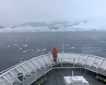 We woke up to cold snowy weather! It had snowed several inches overnight, so the deckhands were clearing the snow off the decks for us. The high winds prevented us from our original landing at Neko Harbor, so National Geographic Endurance moved over to nearby Paradise Harbor for our morning activities. We went on Zodiac tours in two rounds, launching into very wavy conditions. We rode the Zodiacs into a surprisingly calm bay at the base of a huge tidewater glacier. It had a 100-foot glacial face, with blue crevasses and white serracs. All around us were dozens of large blue and white icebergs, most of which had calved off the glacier recently.